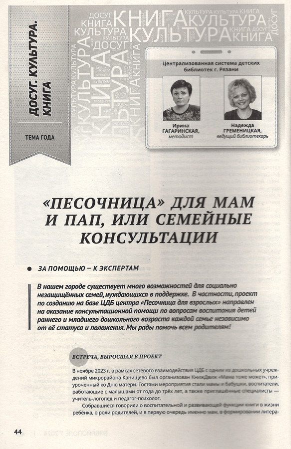 Гагаринская, И. «Песочница» для мам и пап, или семейные консультации / И. Гагаринская, Н. Гременицкая // Библиополе. – 2024. – N 7. – C. 44-49.