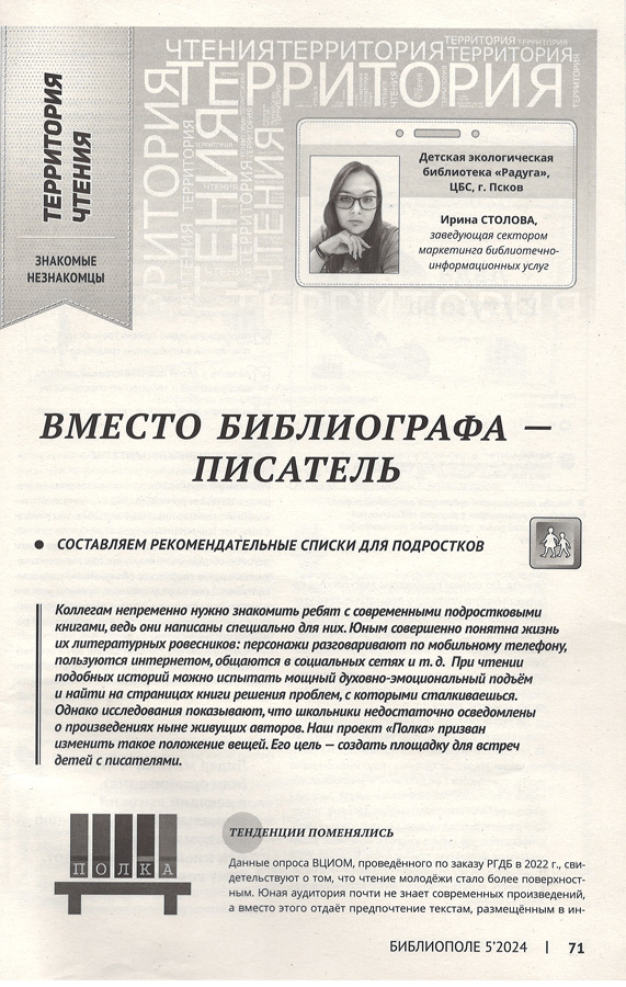Столова, И. Вместо библиографа – писатель // Библиополе. – 2024. – N 5. – С. 71-75.