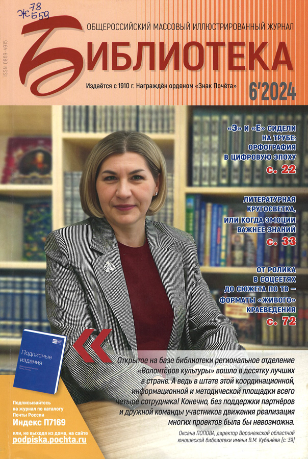 Харитонов, Е.В. Социализация молодого читателя: навигационные инструменты // Современная библиотека. – 2024. – N 5. – С. 8-11.