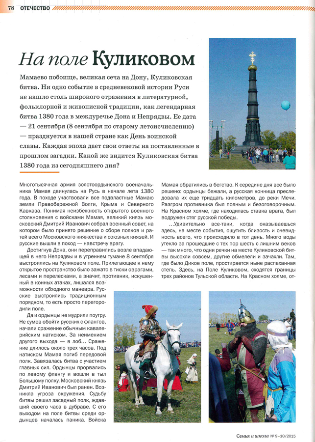 - Медовой, И. На поле Куликовом / И. Медовой // Семья и школа. – 2015. – N 9-10. – С. 78-80.