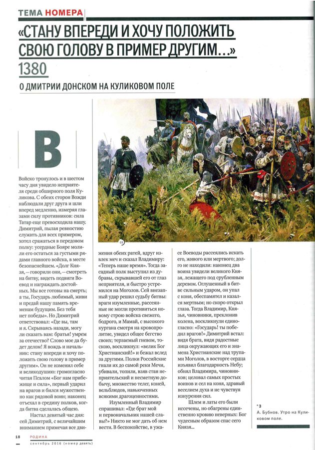 - «Стану впереди и хочу положить свою голову в пример другим…» 1380 : о Дмитрии Донском на Куликовом поле // Родина. – 2016. – N 9. – С. 18