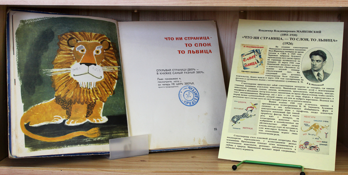 Начало работы над стихотворением «Что ни страница, – то слон, то львица» Владимира Маяковского относится к августу-октябрю 1925 года. 25 марта 1926 года он заключил договор с издательством Заккнига («Закавказская книга») на детскую книжку под условным названием «Зоологический сад». На другой день рукопись была сдана в издательство, а увидела свет лишь 1928 году под выразительным заглавием «Что ни страница, – то слон, то львица» и рисунками К. Зданевича.