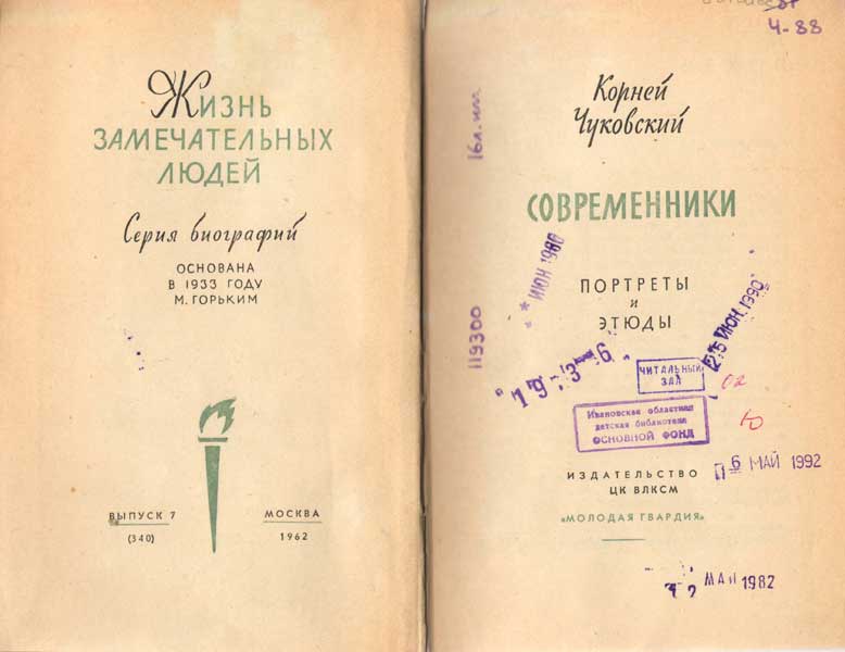 - Чуковский, К.И. Современники. Портреты и этюды / Корней Чуковский. – М. : Молодая гвардия, 1962. – 704 с., [16] л. ил. – (Жизнь замечательных людей : ЖЗЛ : сер. биогр. ; вып. 7 (340)).