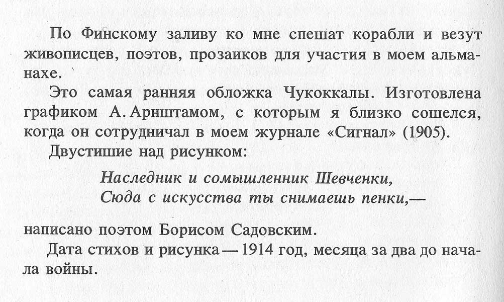 «Бродя со своими гостями по вязким прибрежным пескам, сидя с ними у себя на веранде или в мастерской у Репина, Корней Иванович предпринял попытку сохранить следы и голоса. Он завел альбом для автографов и рисунков. Репин дал этой затее имя: соединил начало фамилии владельца «Чук» с концом названия поселка «оккала». (Чуковская Л.К. Памяти детства)