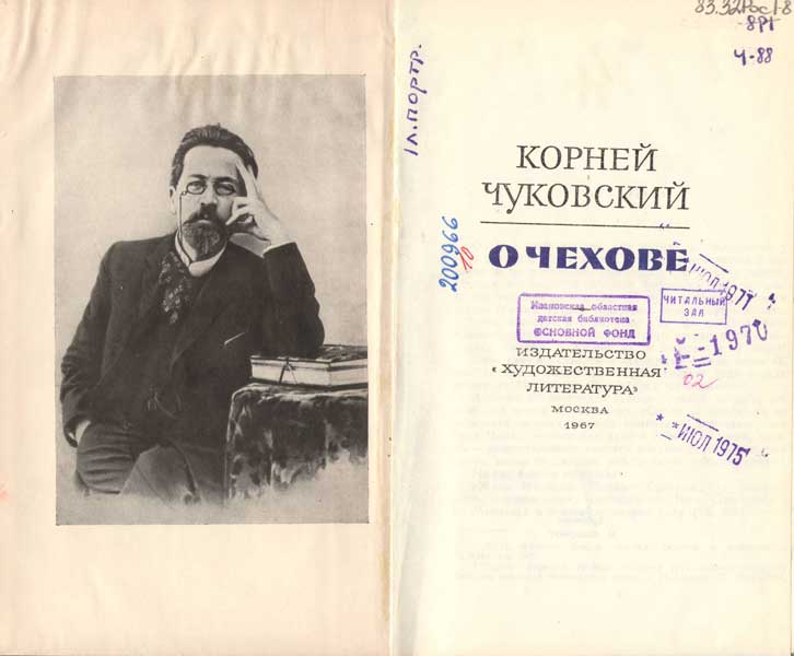 - Чуковский, К.И. О Чехове / Корней Чуковский ; худож. М. Шлосберг. – М. : Худож. лит., 1967. – 207 с., 1 л. портр.