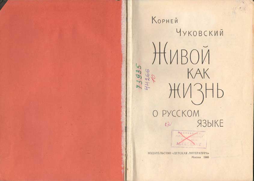- Чуковский, К.И. Живой как жизнь. О русском языке : [для сред. и ст. возраста ] / Корней Чуковский. – М. : Дет. лит., 1966. – 207 с. : ил.