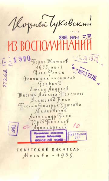 - Чуковский, К.И. Из воспоминаний / Корней Чуковский. – М. : Сов. писатель, 1959. – 463 с., [8] л. ил.