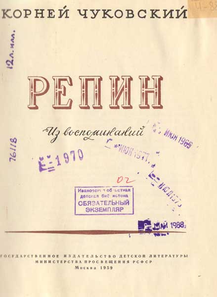 - Чуковский, К.И. Репин. Из воспоминаний / Корней Чуковский. – М. : Детгиз, 1959. - 120 с., [12] л. ил. – (Школьная библиотека).