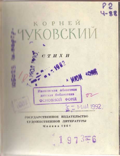 - Чуковский, К.И. Стихи / Корней Чуковский ; редкол. В.М. Инбер [и др.]. – М. : Гослитиздат, 1961. – 175 с., 1 л. портр. – (Библиотека советской поэзии).