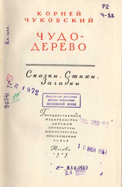 - Чуковский, К.И. Чудо-дерево : сказки, стихи, загадки / Корней Чуковский ; послесл. В. Смирновой ; рис. Ф. Лемкуля, В. Конашевича. – М. : Детгиз, 1959. – 255 с. : ил., [8] л. ил. – (Золотая библиотека. Избранные произведения для детей и юношества).