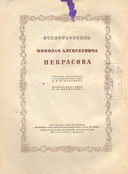 - Некрасов, Н.А. Стихотворения / Николай Некрасов ; ред., примеч. и биогр. очерк К.И. Чуковского ; вступ. ст. В.Я. Кирпотина. – М.-Л. : ЦК ВЛКСМ : Детиздат, 1938. – 499 с., [7] л. ил.