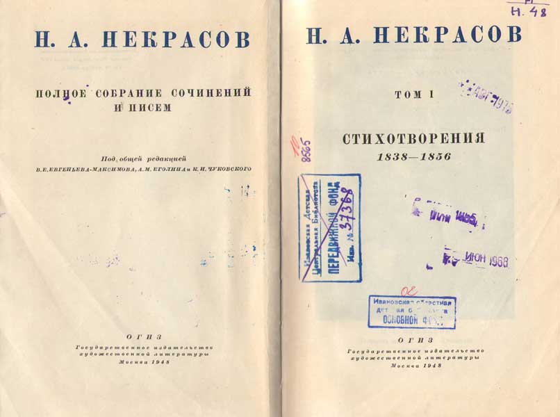 - Некрасов, Н.А. Полное собрание сочинений и писем : [в 12 т.] Т. 1 : Стихотворения, 1838-1856 / Николай Некрасов ; под общ. ред. В.Е. Евгеньева-Максимова, А.М. Еголина и К.И. Чуковского. – М. : Гослитиздат, 1948. – 647 с.