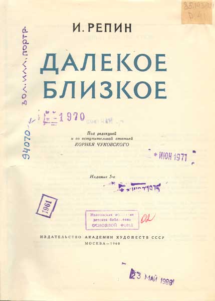 - Репин, И.Е. Далекое близкое / Илья Репин ; под ред. и со вступ. ст. К. Чуковского. – Изд. 5-е. – М. : Изд-во Акад. художеств СССР, 1960. – 511 с., [30] л. ил., портр.