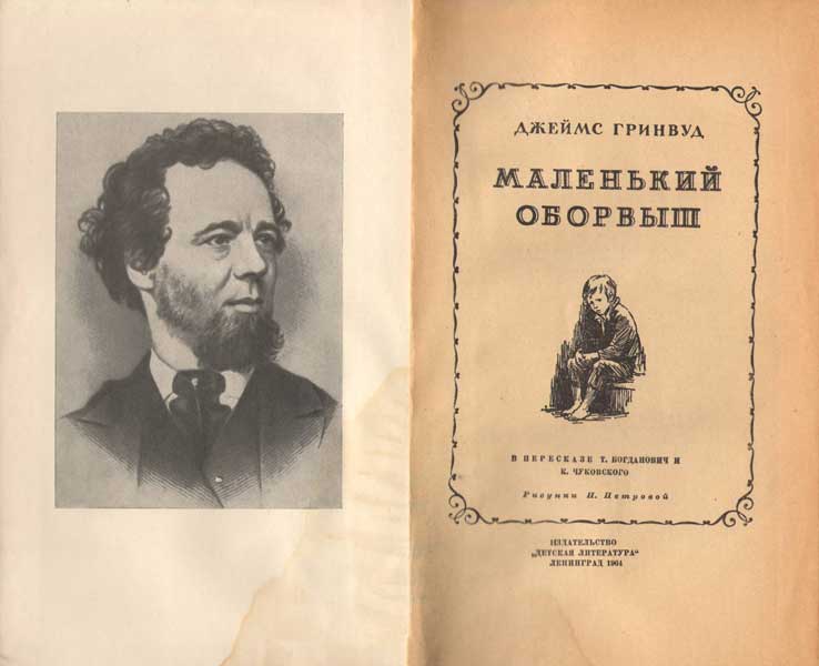 - Гринвуд, Д. Маленький оборвыш / Джеймс Гринвуд ; пересказ Т. Богданович и К. Чуковского ; рис. Н. Петровой ; предисл. Е. Брандиса. – Л. : Дет. лит., 1964. – 207 с. : ил., 1 л. портр. – (Школьная библиотека).