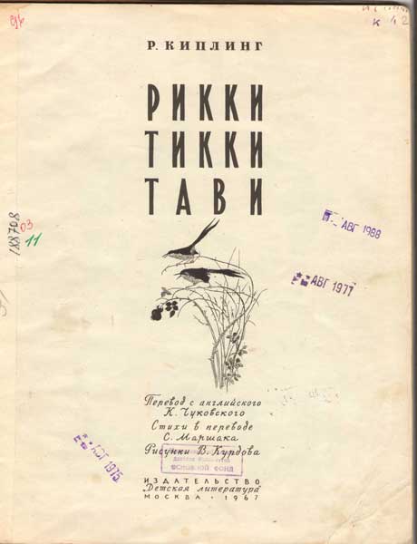- Киплинг, Р. Рикки-Тикки-Тави : [сказка] / Редьярд Киплинг ; пер. с англ. К. Чуковского ; стихи в переводе С. Маршака ; рис. В. Курдова. – М. : Дет. лит., 1967. – 28 с. : ил.