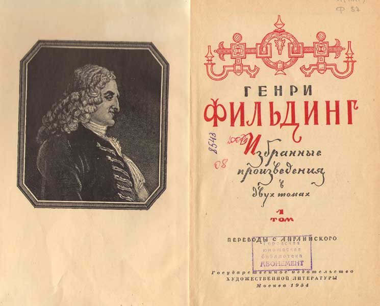- Фильдинг, Г. Избранные произведения : в 2 т. Т. 1 / Генри Фильдинг ; [пер. с англ. К. Чуковского и др.] ; вступ. ст. С.С. Мокульского. – М. : Гослитиздат, 1954. – 756 с., 1 л. портр.