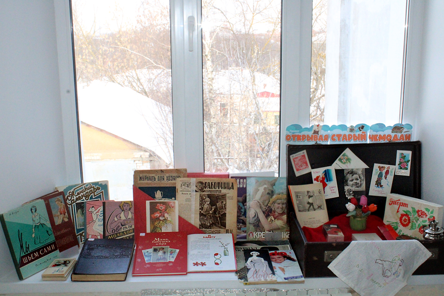 Название «Открывая старый чемодан» – это прежде всего образ. В оформлении экспозиции использован большой фибровый чемодан, который не может вместить всё, что будет представлено вниманию читателей. В ретрофонде хранятся книги, периодические издания, открытки, кроме того, уже сложилось собрание вещей прошлых лет, полученных в дар от читателей. Часто небольшие предметы библиотекари находят и в книгах: закладки, листки из отрывного календаря, билетики и т.д. Всё это объединено в коллекцию «Книжное бюро находок».