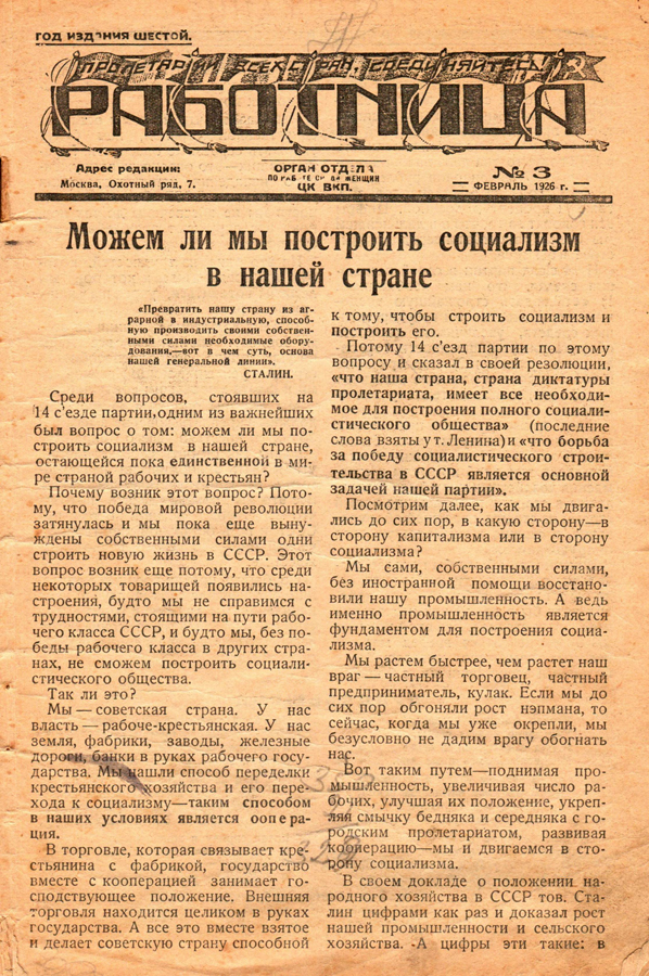 В ретрофонде сохранились единичные номера журнала «Работница» за 1926 и 1933 годы. Номер, выпущенный в 1933 году, открывается статьей «Мобилизуем энтузиазм работниц на борьбу за уголь». Здесь же напечатаны статьи о встрече работницы Аболиной с товарищем Буденным; о контроле делегаток и активисток за работой яслей и другие материалы на производственные темы.