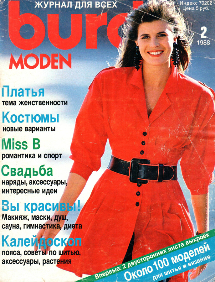 Самым востребованным в конце ХХ века был журнал Burda Moden. Официально журнал издавался в СССР с 1987 года. Большинство женщин, конечно, привлекало приобщение к миру западной моды. Burda Moden, собственно, и сделал себе имя, предлагая модную одежду на каждый день. О популярности говорит хотя бы тот факт, что материалы из него активно перепечатывали советские издания, например, «Работница». Другой важный фактор спроса – наличие качественных выкроек, которыми можно было сразу пользоваться.