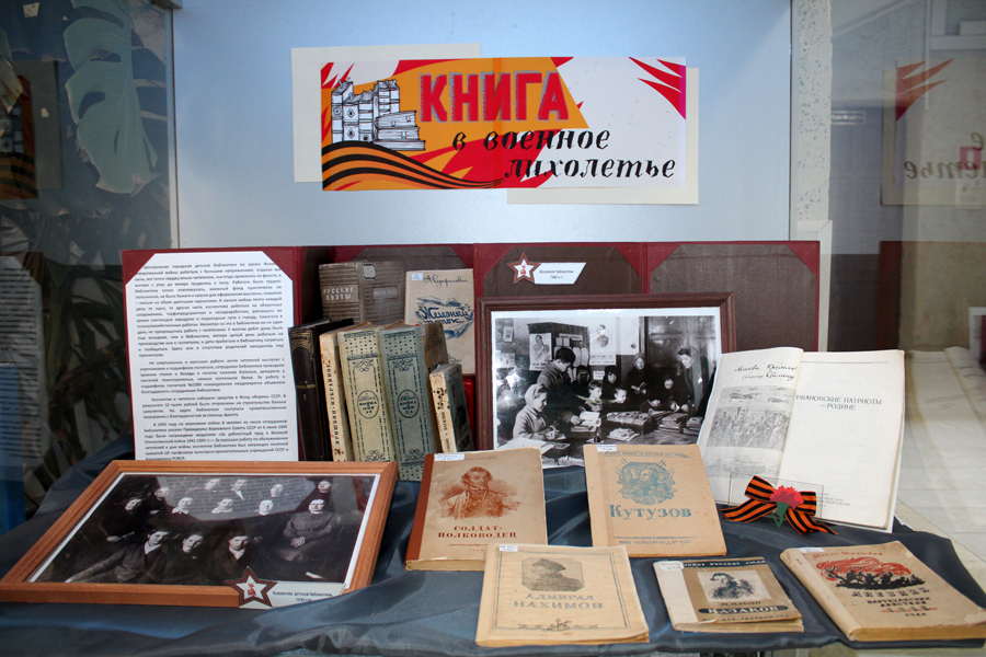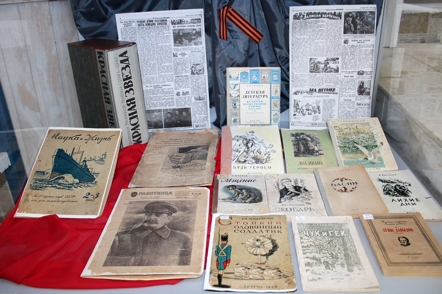 В годы войны было выпущено 109 100 названий книг общим тиражом 1 млрд 691 млн 500 тыс. экземпляров при среднем тираже одного издания 15,5 тыс. экземпляров. В военные годы не прекращался выпуск литературы для детей и юношества. Всего в разных издательствах было выпущено 60 млн книг, в том числе 25 млн (509 названий) – в Детгизе. Ведущее место по значимости занимала общественно-политическая и социально-экономическая литература. Большими тиражами выпускались книги, пропагандирующие любовь к Родине, патриотизм, бесстрашие и героизм. Исключительной популярностью пользовались издания серии «Великие русские полководцы» (А. Невский, Д. Донской, М.И. Кутузов, А.В. Суворов и др.), продолжение серии «ЖЗЛ» «Великие русские люди» (И.П. Павлов, К.А. Тимирязев, И.Е. Репин, В.А. Жуковский, А.С. Пушкин, М.И. Глинка, К.Д. Ушинский и др. В экспозиции эти серии представлены несколькими книгами. Они невелики по формату, изданы на дешевой пожелтевшей бумаге с черно-белыми иллюстрациями.