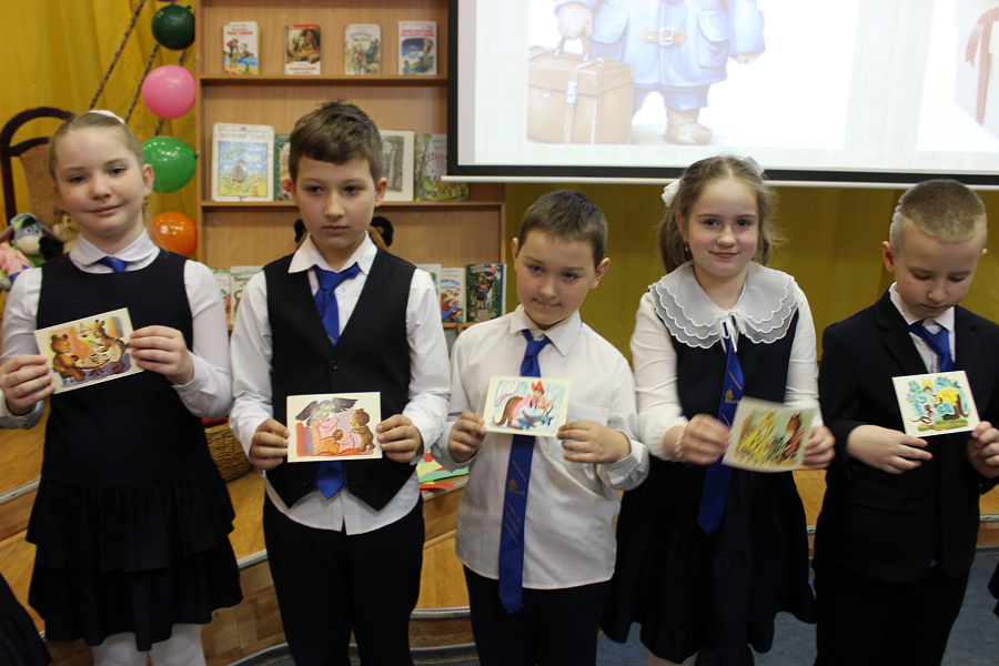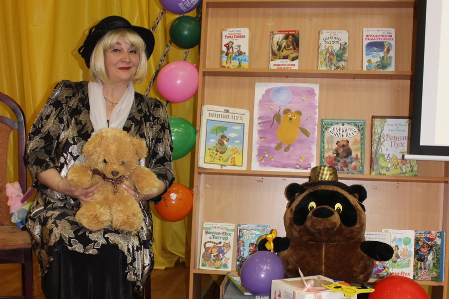Первоклассники из лицея N 21 подарили Винни картонные фигурки медвежонка с похвалой герою любимой книги, а Артём Смиренников из гимназии N 32 преподнёс библиотечным актёрам картину «Винни». В завершение праздника ребята посмотрели выставку ярких изданий Марка Твена и Алана Милна, а также коллекцию старых открыток по книге «Винни-Пух».