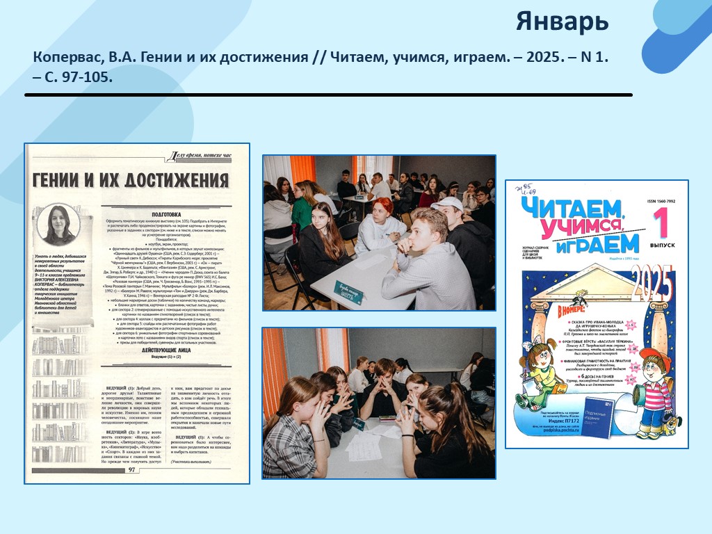 - Голубева Е.В. «Основатели»: первая в Ивановской области настольная краеведческая игра / Е.В. Голубева, А.А. Дубинская, В.А. Копервас // Региональная культура 3.0: традиции и инновации сферы культуры перед вызовами времени : материалы научно-практической конференции в рамках ХХ Королевских чтений / Департамент культуры Ивановской области, ГБУИО «Центральная универсальная научная библиотека» ; отв. за вып.: В.В. Можжухин. – Иваново, 2025. – С. 52-58. (Скачать)