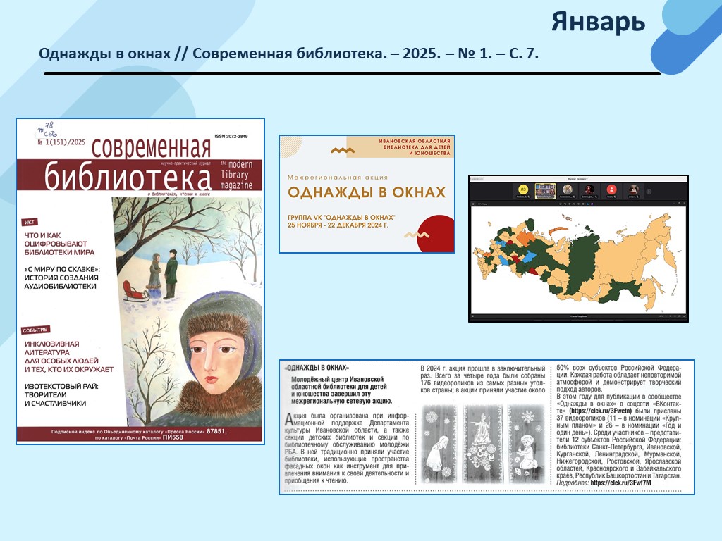 - Однажды в окнах // Современная библиотека. – 2025. – N 1. – С. 7. (Скачать)