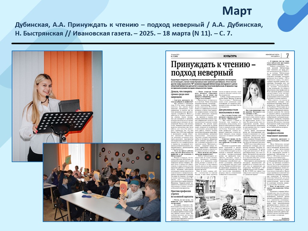 - Дубинская, А.А. Принуждать к чтению – подход неверный / А.А. Дубинская, Н. Быстрянская // Ивановская газета. – 2025. – 18 марта (N 11). – С. 7. (Скачать)
