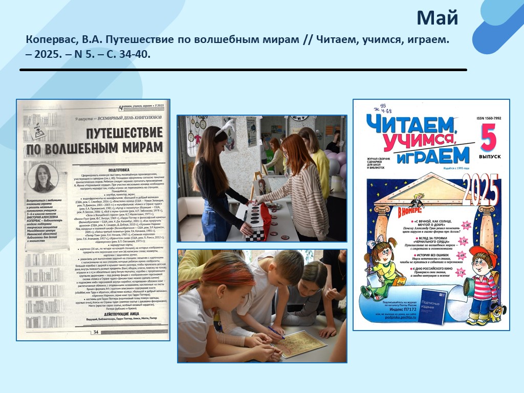 - Копервас, В.А. Путешествие по волшебным мирам // Читаем, учимся, играем. – 2025. – N 5. – С. 34-40. (Скачать)