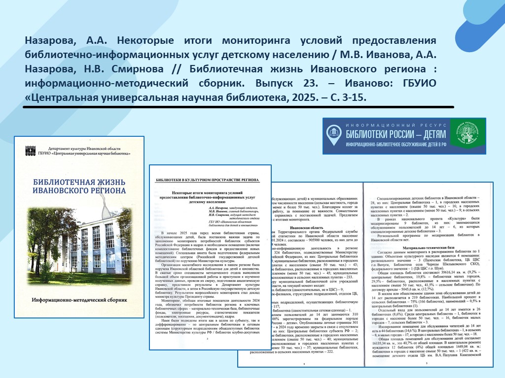 - Назарова, А.А. Некоторые итоги мониторинга условий предоставления библиотечно-информационных услуг детскому населению / М.В. Иванова, А.А. Назарова, Н.В. Смирнова // Библиотечная жизнь Ивановского региона : информационно-методический сборник. Выпуск 23. – Иваново: ГБУИО «Центральная универсальная научная библиотека, 2025. – С. 3-15. (Скачать)