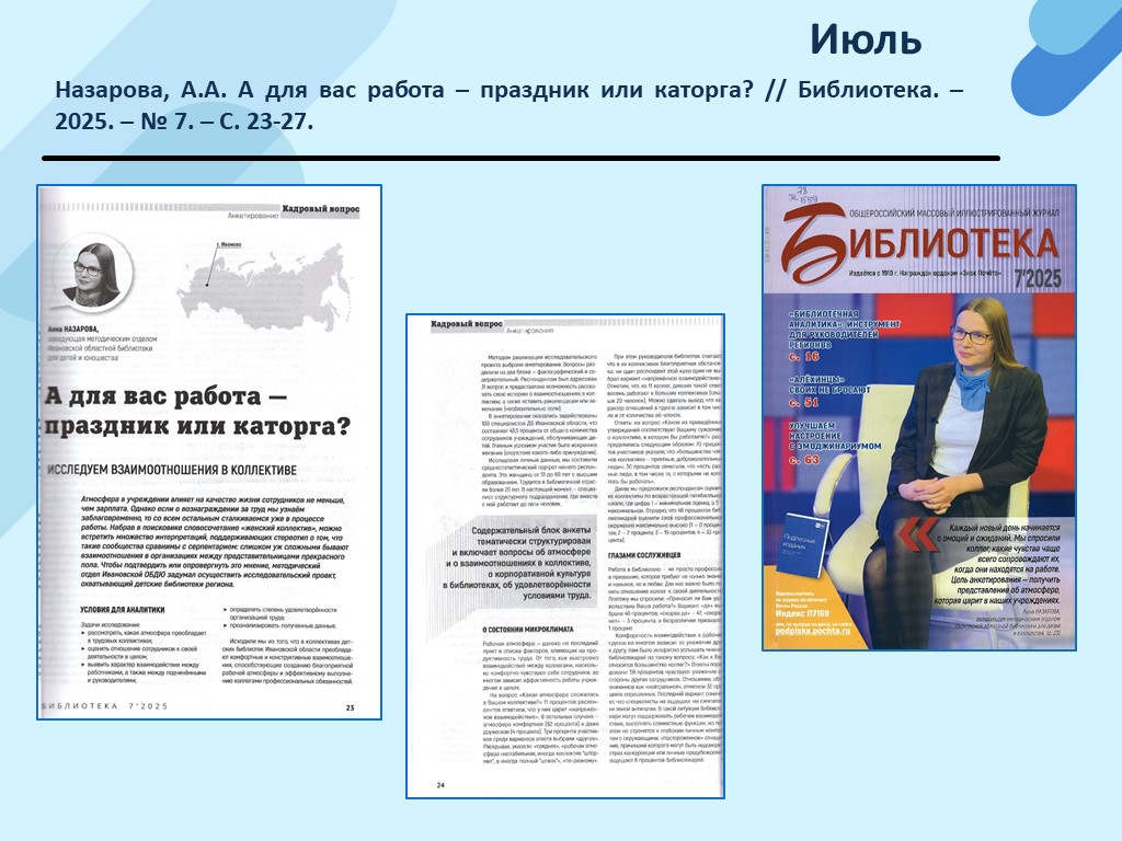 - Назарова, А.А. А для вас работа – праздник или каторга? // Библиотека. – 2025. – N 7. – С. 23-27. (Скачать)