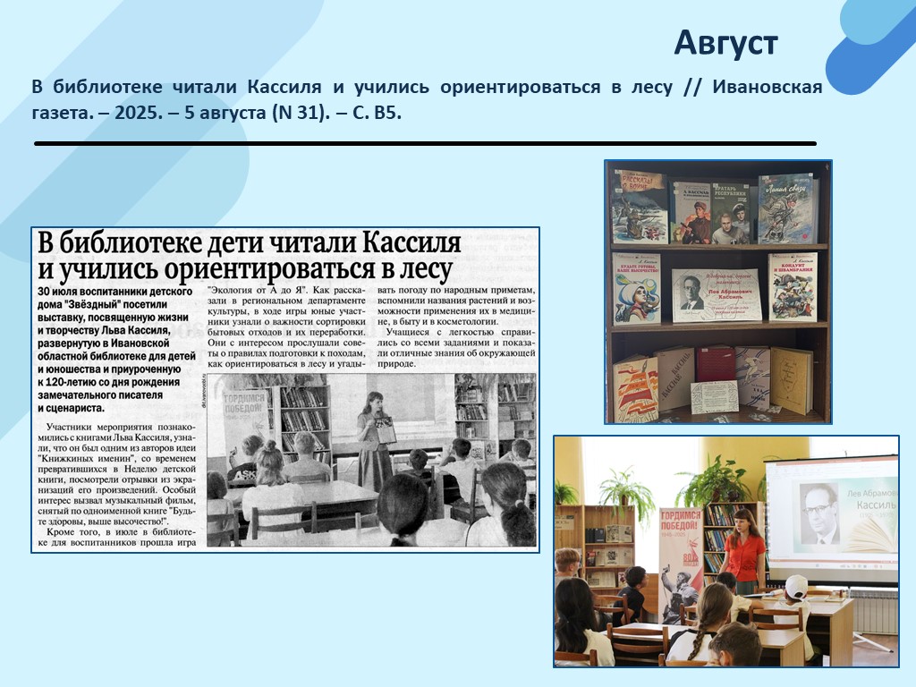- В библиотеке дети читали Кассиля и учились ориентироваться в лесу // Ивановская газета. – 2025. – 5 августа (N 31). – С. В5. (Скачать)