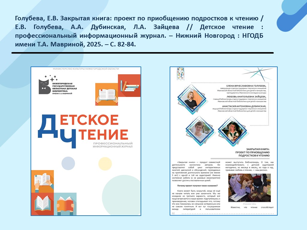 - Голубева, Е.В. Закрытая книга: проект по приобщению подростков к чтению / Е.В. Голубева, А.А. Дубинская, Л.А. Зайцева // Детское чтение : профессиональный информационный журнал. – Нижний Новгород : НГОДБ имени Т.А. Мавриной, 2025. – С. 82-84. (Скачать)