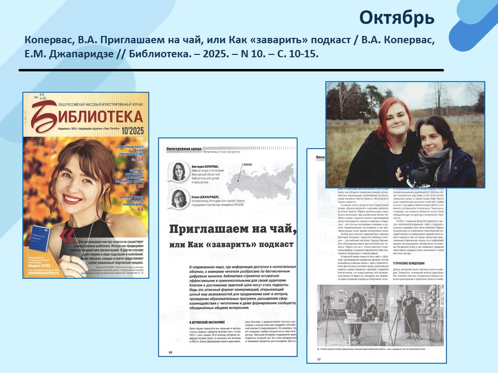 - Копервас, В.А. Приглашаем на чай, или Как «заварить» подкаст / В.А. Копервас, Е.М. Джапаридзе // Библиотека. – 2025. – N 10. – С. 10-15. (Скачать)