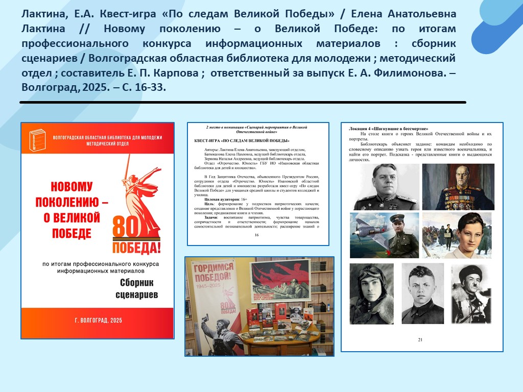 - Лактина, Е.А. Квест-игра «По следам Великой Победы» / Елена Анатольевна Лактина // Новому поколению – о Великой Победе: по итогам профессионального конкурса информационных материалов : сборник сценариев / Волгоградская областная библиотека для молодежи ; методический отдел ; составитель Е. П. Карпова ; ответственный за выпуск Е. А. Филимонова. – Волгоград, 2025. – С. 16-33. (Скачать)