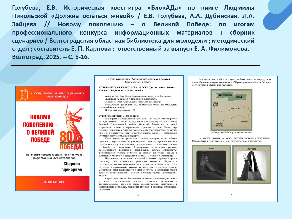 - Голубева, Е.В. Историческая квест-игра «БлокАДа» по книге Людмилы Никольской «Должна остаться живой» / Е.В. Голубева, А.А. Дубинская, Л.А. Зайцева // Новому поколению – о Великой Победе: по итогам профессионального конкурса информационных материалов : сборник сценариев / Волгоградская областная библиотека для молодежи ; методический отдел ; составитель Е. П. Карпова ; ответственный за выпуск Е. А. Филимонова. – Волгоград, 2025. – С. 5-16. (Скачать)