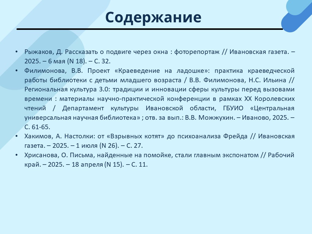 - Филимонова В.В. Проект «Краеведение на ладошке»: практика краеведческой работы библиотеки с детьми младшего возраста / В.В. Филимонова, Н.С. Ильина // Региональная культура 3.0: традиции и инновации сферы культуры перед вызовами времени : материалы научно-практической конференции в рамках ХХ Королевских чтений / Департамент культуры Ивановской области, ГБУИО «Центральная универсальная научная библиотека» ; отв. за вып.: В.В. Можжухин. – Иваново, 2025. – С. 61-65. (Скачать)