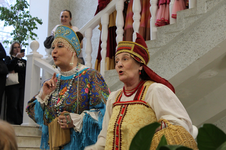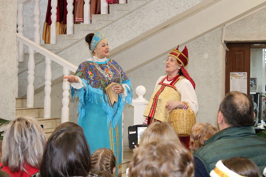 Открыл праздник просветительский театр книги «Корноватка» на главной лестнице Дома на Крутицкой. Библиотечные актеры – Ольга Шишкина и Ирина Смирнова – пригласили гостей в увлекательное путешествие по библиотечным залам, наполненные легендами и преданиями, отражающими голос и душу народов нашей Отчизны.