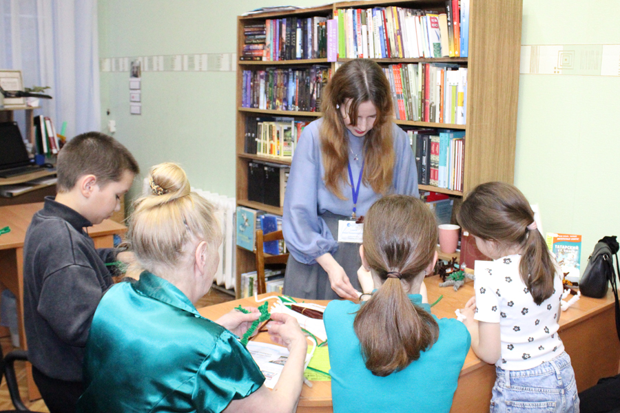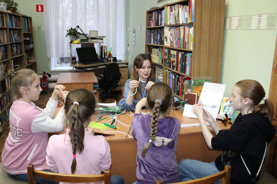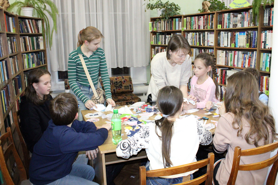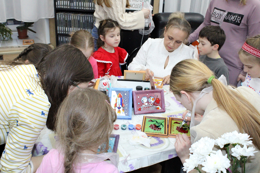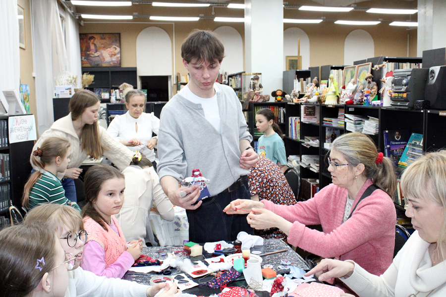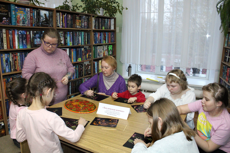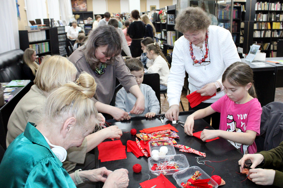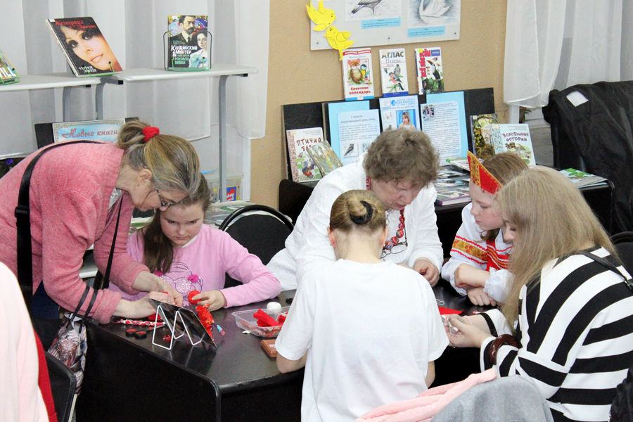 Зал обслуживания читателей превратился в Арт-пространство. Гости библиотеки поучаствовали в мастер-классах под чутким руководством знатоков своего дела. Участников ждали интересные мастер-классы от педагогов декоративно-прикладного направления Центра образовательных трендов «Омега». Виктория Титова предложила сделать «Хохломскую птичку в стиле граттаж». «Открытку своими руками», посвященную Году единства народов России, мастерили под руководством Елены Ковалевой. Милых куколок предложила изготовить Ирина Иванчихина, а вместе с библиотекарем Анной Сивак гости библиотеки сделали шурале – татарского лешего из синельной проволоки.