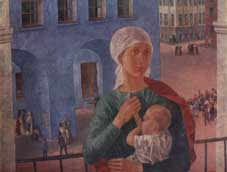 На картине "Петроградская Мадонна" изображена молодая женщина с грудным ребёнком на фоне революционного Петрограда. Ее изображение напоминает образ Богоматери. Она повернулась спиной к городу неслучайно. Ее главные заботы - заботы о ребенке, о его настоящем и будущем.