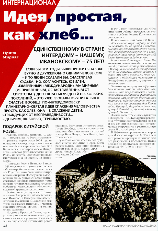 Историю Ивановского Интердома не описать и в тысячах книг. Это был первый, один из крупнейших не только в Восточной Европе, но и во всем мире Дом дружбы. За время существования Интердома через него прошло около 5000 детей из 85-ти стран. Его называли «Красной колыбелью» революционного поколения. Дом дружбы был открыт в тот период, когда Советский Союз как «старший брат» мирового коммунистического движения стремился помочь революционерам всего мира, взяв на себя заботу об их детях. История Интердома как зеркало отразила все перипетии XX столетия.