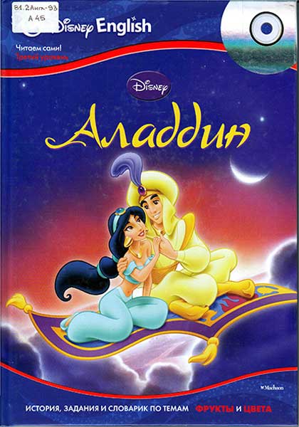 - Аладдин : история, задания и словарик по темам «Фрукты», «Цвета» : [для детей среднего школьного возраста] / пересказ К. Реган ; пер. с англ. И. Евтишенков. – М. : Махаон, 2013. – 44 с. : ил. + 1 CD. – (Disney English).