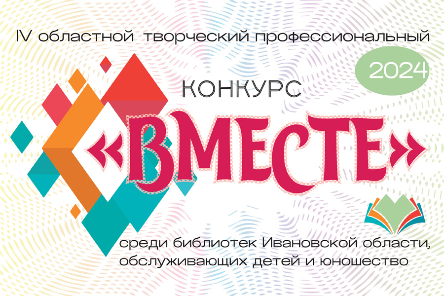 Уважаемые коллеги! Ивановская областная библиотека для детей и юношества приглашает к участию в IV областном творческом профессиональном конкурсе «Вместе» среди библиотек Ивановской области, обслуживающих детей и юношество. Профессиональное мероприятие проводится при поддержке Департамента культуры Ивановской области.