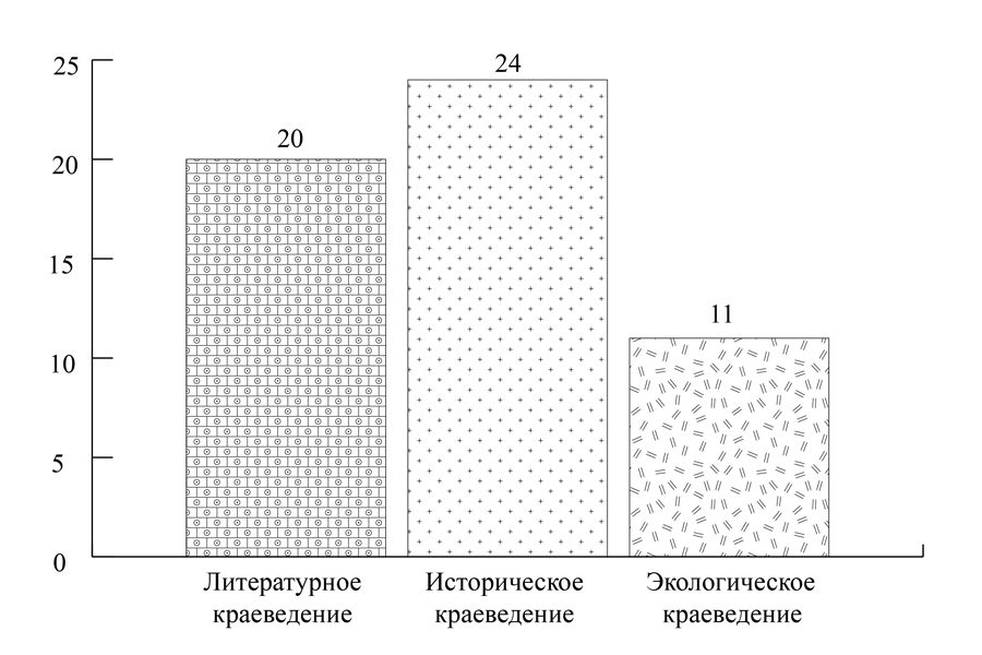Ответы участников исследования показывают, что историческое краеведение, наряду с литературным, пользуется большим вниманием у аудитории (24 и 20 ответов соответственно), менее востребовано экологическое краеведение (11 упоминаний).