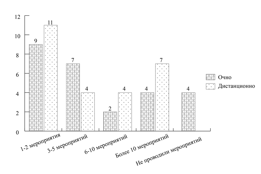 Все респонденты отметили, что у них в библиотеках проводились дистанционные мероприятия. Площадки реализации: сайты и представительства в социальных сетях. Среднее количество проведенных онлайн-инициатив приведем в таблице. Наиболее активно в интернет-пространстве работали Городская ЦБС г. Фурманова: коллеги провели 19 тематических мероприятий.