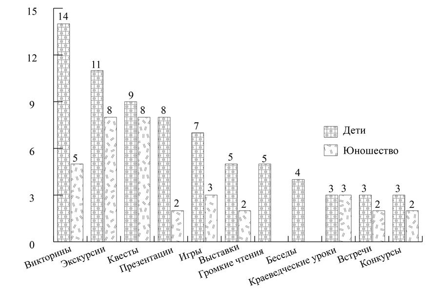 - Подростковая и юношеская аудитории предпочитают квесты, экскурсии, викторины, беседы, игры и краеведческие уроки.