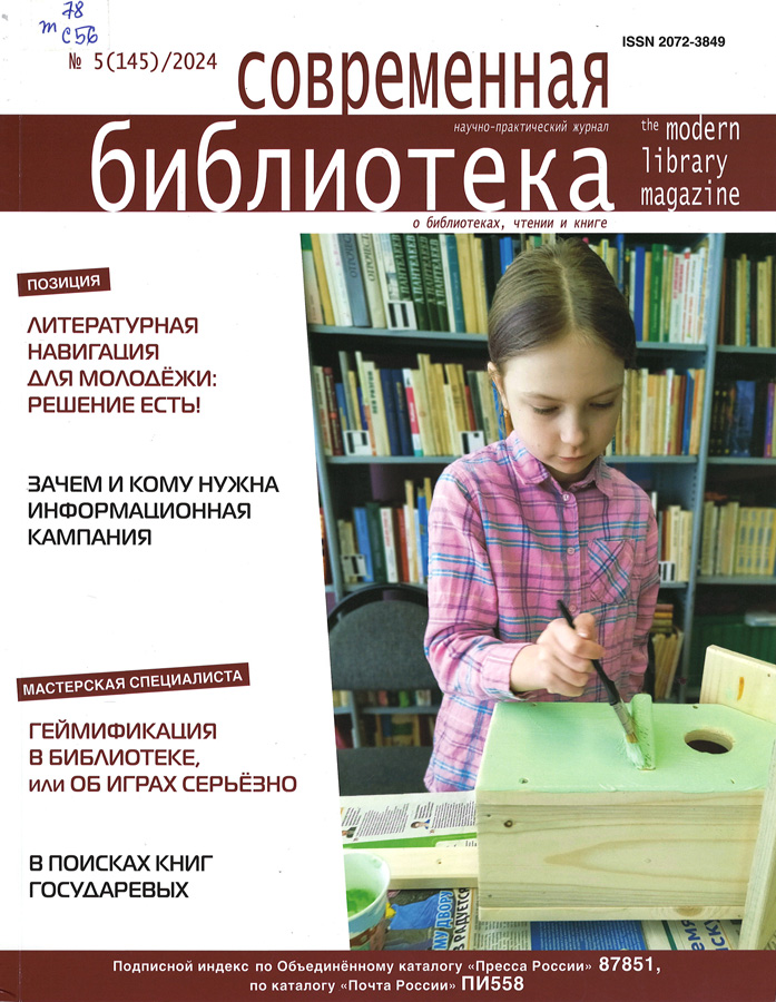 Харитонов, Е.В. Социализация молодого читателя: навигационные инструменты // Современная библиотека. – 2024. – N 5. – С. 8-11.