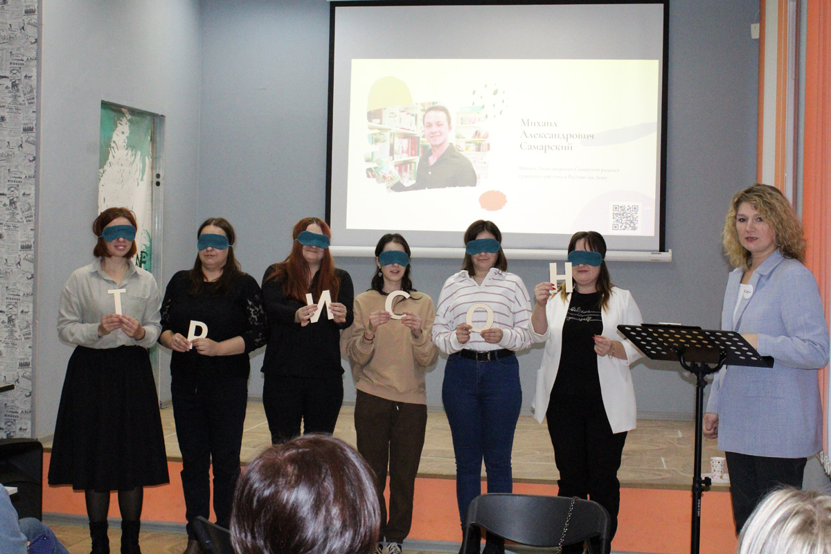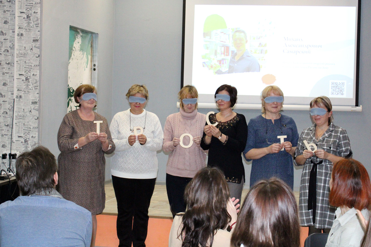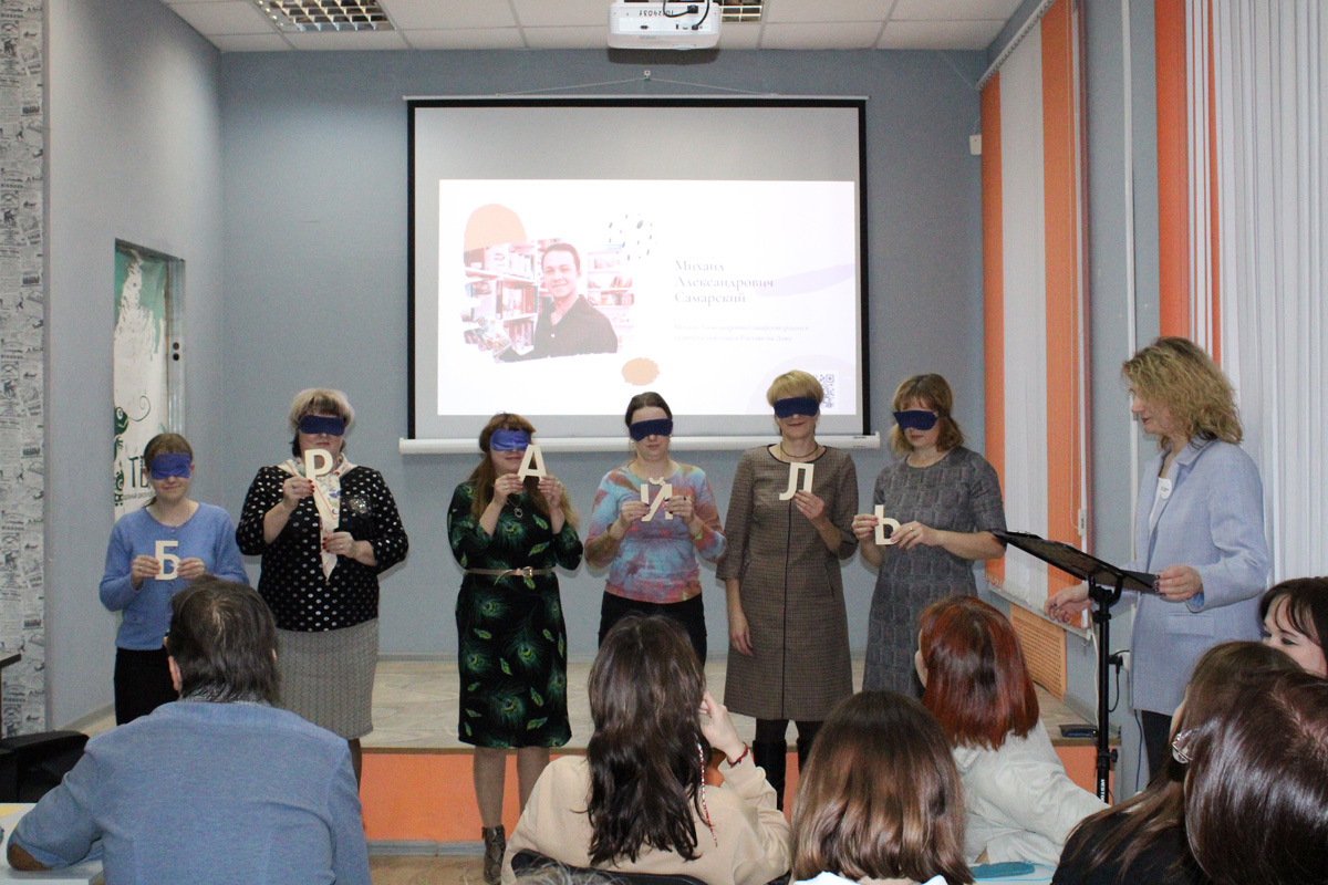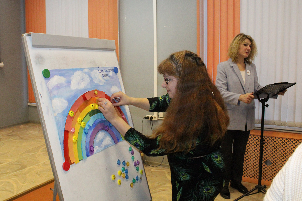 Мастер-класс «Радуга для друга» специалистов Отдела поддержки творческих инициатив ИОБДЮ Елены Вячеславовны Голубевой и Анастасии Антоновны Дубинской открыл участникам семинара некоторые приёмы общения и методы работы с читателями. Коллеги познакомили с проектом «Закрытая книга», который представляет собой цикл интерактивных занятий, дискуссий и обсуждений произведений современной литературы, проводимых на протяжении длительного периода времени с одной и той же аудиторией, и является наглядным примером привлечения подростков к интеллектуальному досугу в библиотеке. Ярким моментом выступления стало практическое занятие по книге Михаила Самарского «Радуга для друга», в котором смогли принять участие муниципальные библиотекари.