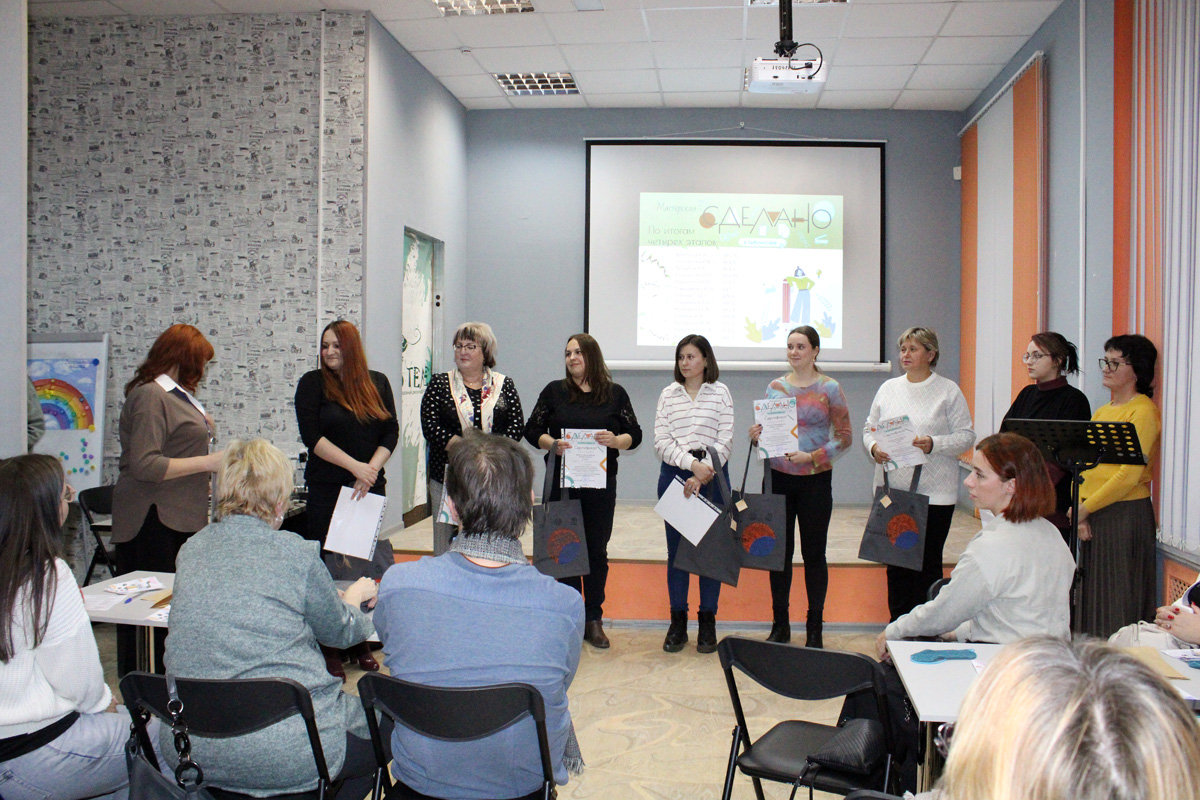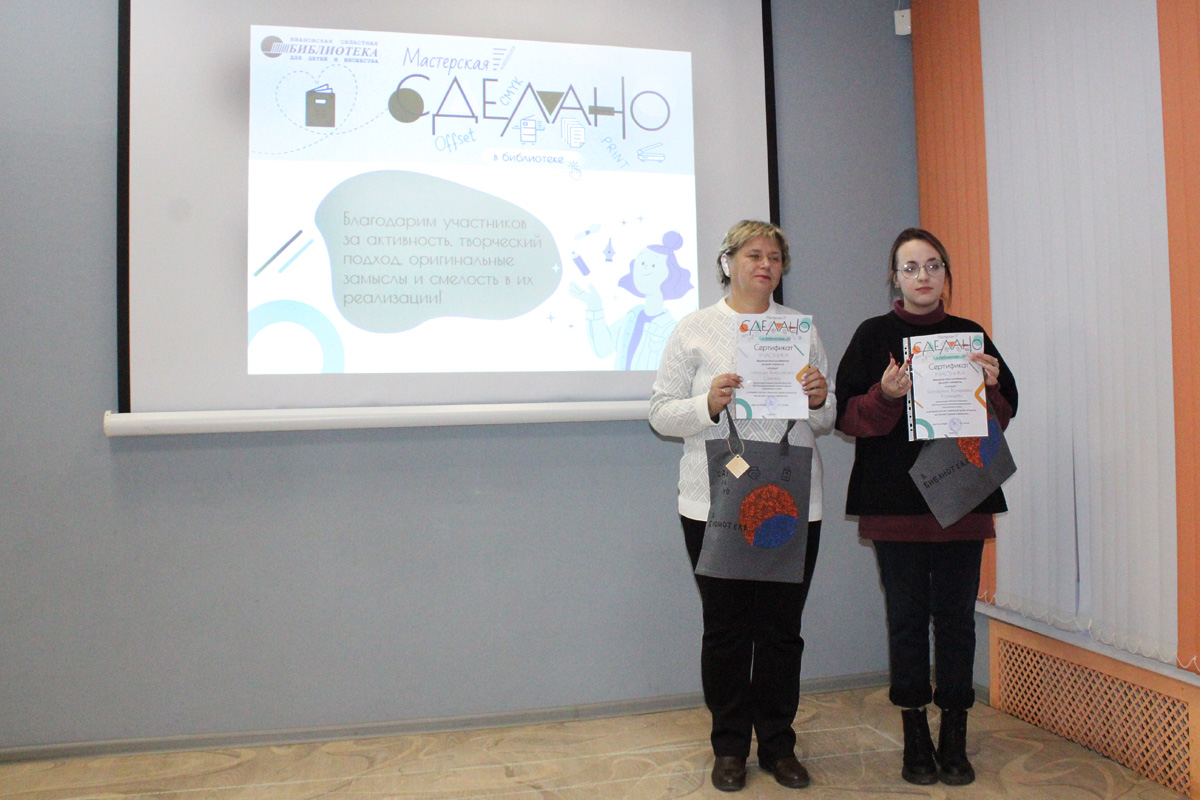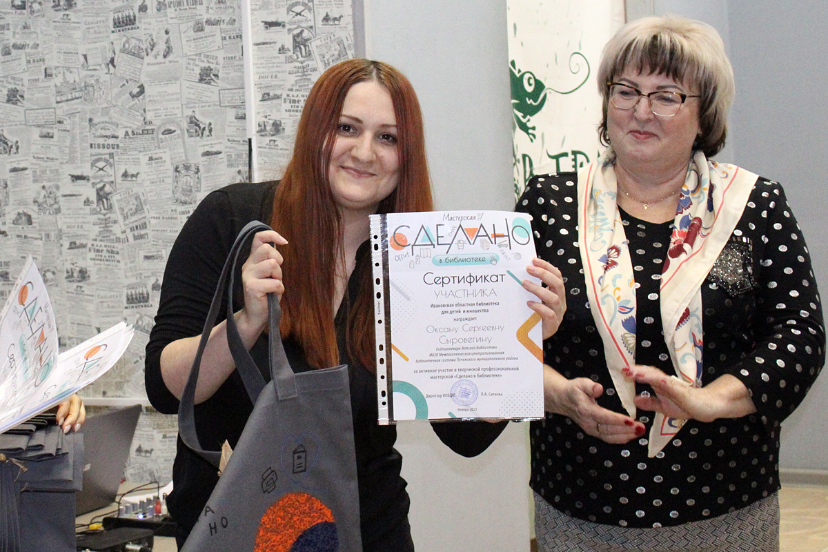 Торжественным моментом семинара стало подведение итогов и церемония награждения участников творческой мастерской «Сделано в библиотеке». В рамках данной инициативы библиотекари на протяжении нескольких месяцев осваивали секреты мастерства редактора, знакомились с разными формами издательской деятельности под руководством главного библиотекаря методического отдела Ивановской областной библиотеки для детей и юношества Плюсниной Натальи Владимировны. По решению жюри победителем признана Крылова Анастасия Алексеевна, заведующая Плёсской городской детской библиотекой МКУ КБО Плесского городского поселения.