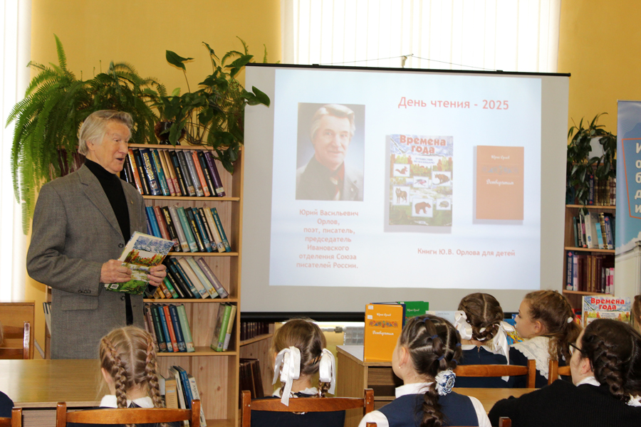 Яркой страницей Областного для чтения стала встреча с ивановским писателем Ю.В. Орловым «Стихи детям», организованная в библиотеке на Крутицкой. Юрий Васильевич рассказал о том, как начал писать стихи, поделился со школьниками секретами мастерства. В уютной и непринужденной обстановке дети погрузились в мир поэзии, прочитали строки из сборников «Детворята» и «Времена года». Занятие по творчеству Ю.В. Орлова состоялось и для учащихся Ивановской коррекционной школы-интерната N 1. Ребята узнали о поэтах, повлиявших на становление литератора, о том, что он истинный патриот совей Родины, а все важные события в истории страны находят отношение в его произведениях. На мероприятии прозвучали стихи из сборников «Родину завещаю», «Родственные души», «России путь – и горестный и славный».